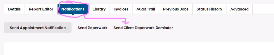 You will be able to request this by pressing the 'Notifications' tab which you will find in the subheading tab on a job, and then the 'Send Client Paperwork Reminder' this will send an email directly to the client contact, who is attached to the specific job asking them to attach any previous paperwork they have to the library tab on the job.